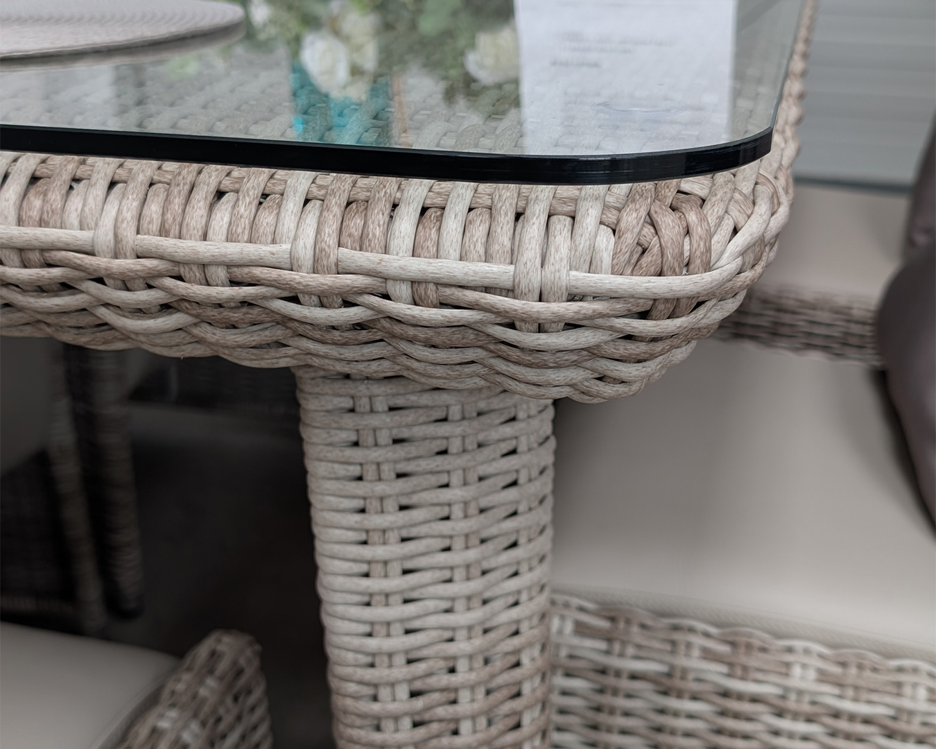 Elevate your outdoor dining experience with our IMPERIAL Dining Set. Elegant rattan finish across the table and dining chairs add class to any garden or outdoor space. Aluminium frame provides you with long lasting quality no matter what’s the weather. Leatherette Seat Cushion covers add extra class and comfort to these high back chairs. Tempered Glass table top secured with suction cups provides safety you need for family or party dining experiences.