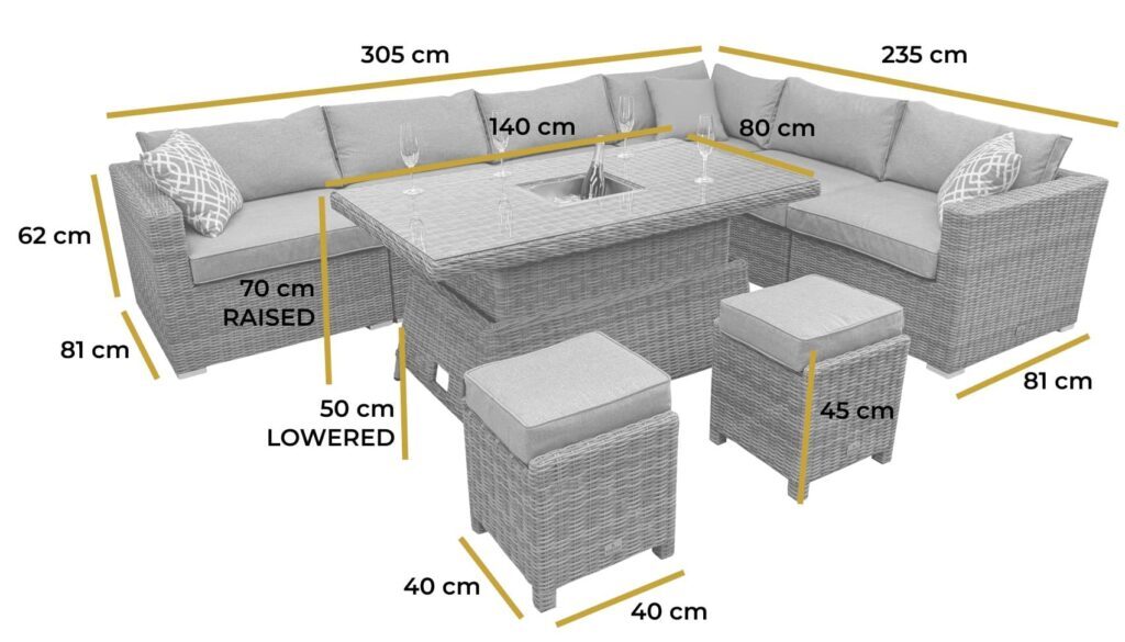At the heart of the set sits the Spacious Rising Ice Bucket Table, creating a party feel for daytime or evening gatherings while doubling as a practical surface quick dining. You can raise the table to dining height at 70cm or manually lower it to a lounging height of 50cm. It’s the ideal centrepiece for relaxing nights, family time, or lively evenings for family or parties. The table and seating feature seat leg caps for uneven surfaces, ensuring stability on patios, decking, or garden lawns.