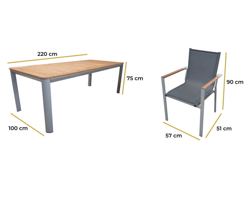 Paired with the table are eight generously proportioned armchairs, designed with comfort firmly in mind. The seats and backs are made from weather-resistant textilene fabric, which is breathable, quick-drying, and wonderfully supportive – ideal for long, leisurely meals outdoors. Adding a premium finishing touch, the armrests are accented with natural teak, enhancing both comfort and visual appeal while tying the whole set together beautifully.