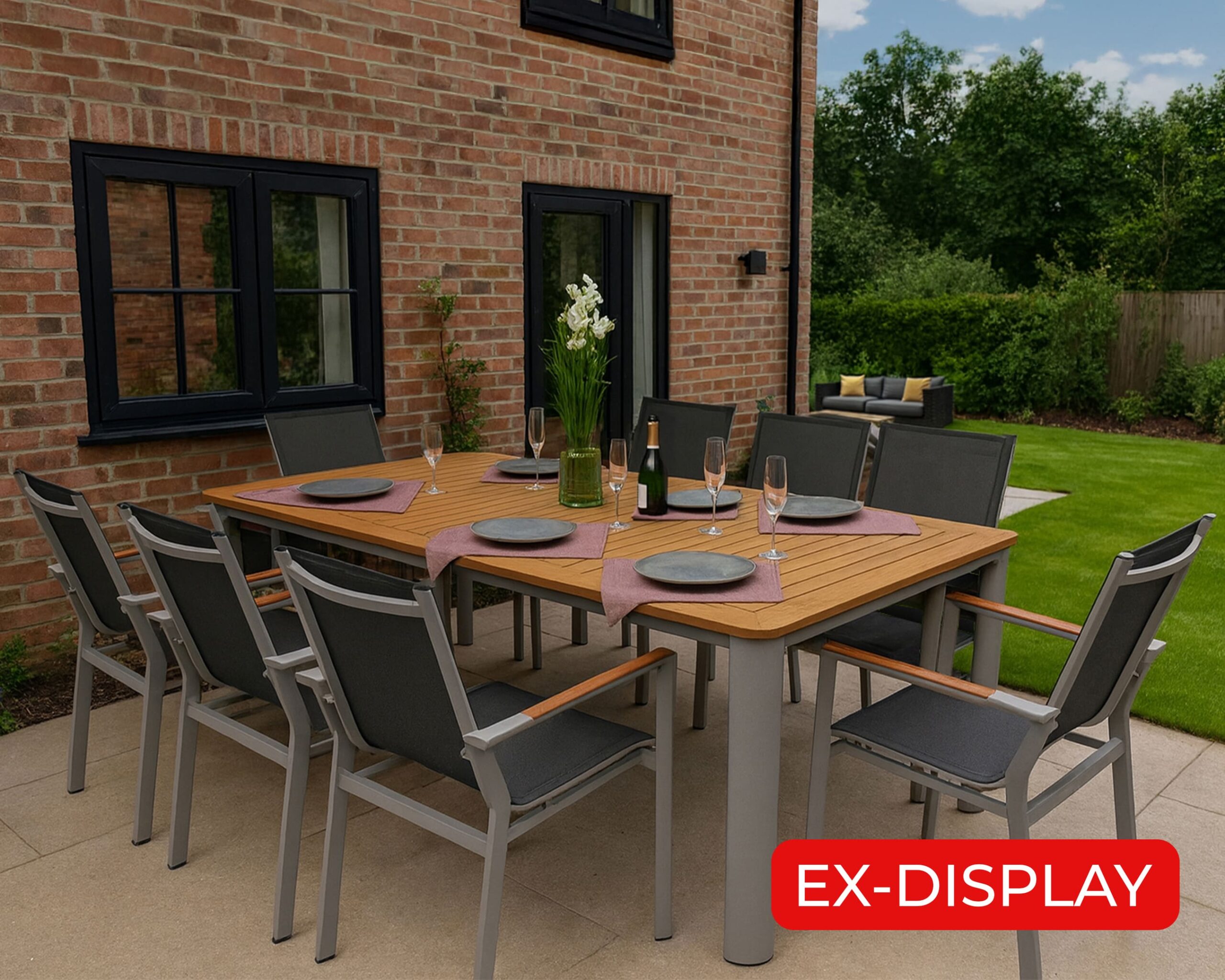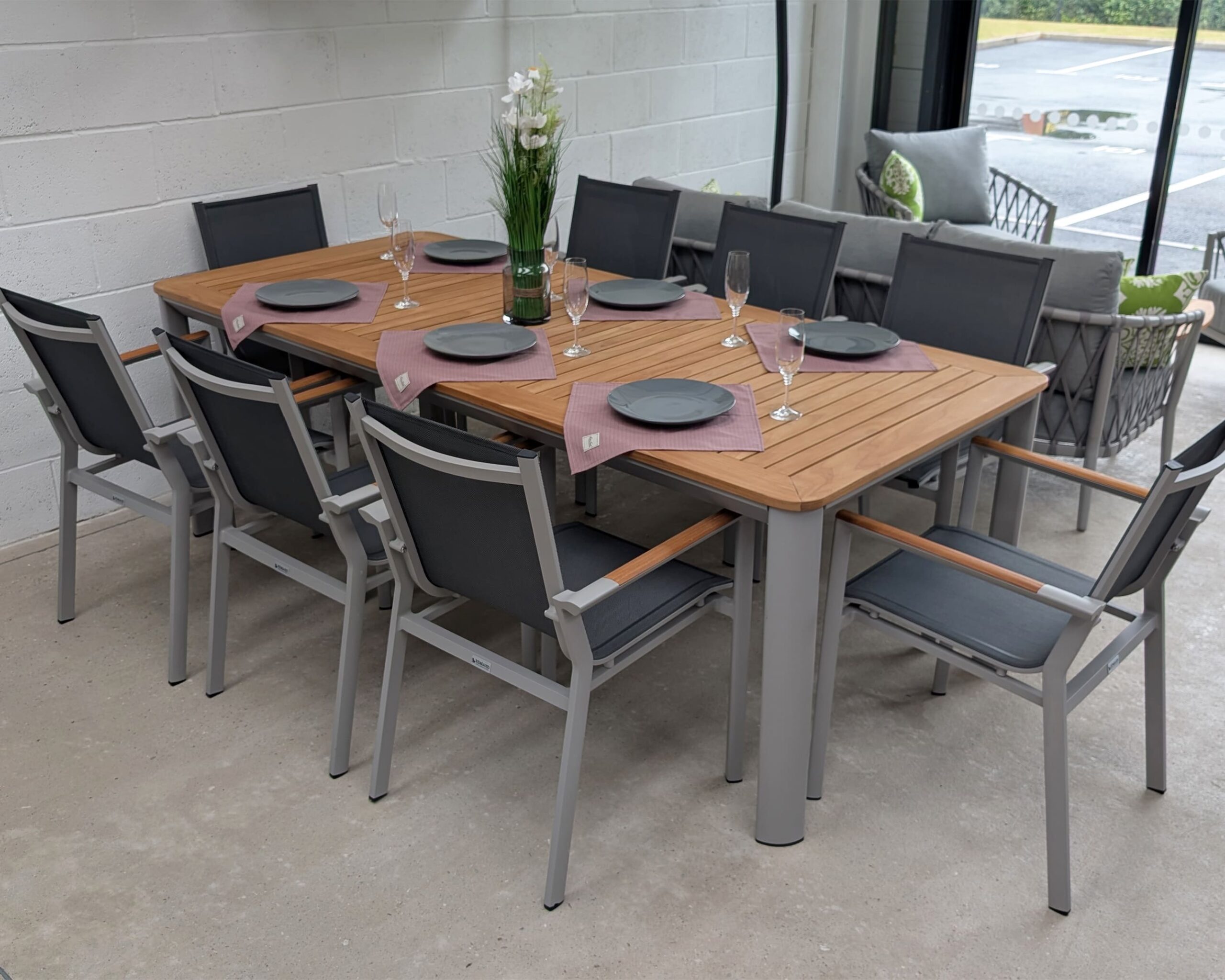 Rengard LAS VEGAS 8 Seat Aluminium Teak Wood Dining Set – Large Table in Grey