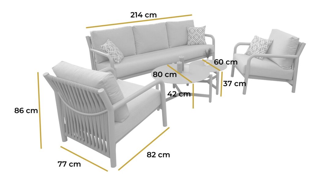 A defining feature of MIAMI sofa set is the beautifully thick olefin rope detailing across the back of the seats, creating a striking visual statement while adding texture and soft, supportive comfort. The curved tubular armrests enhance the flowing, sculptural silhouette, giving the set its unique, modern character.
