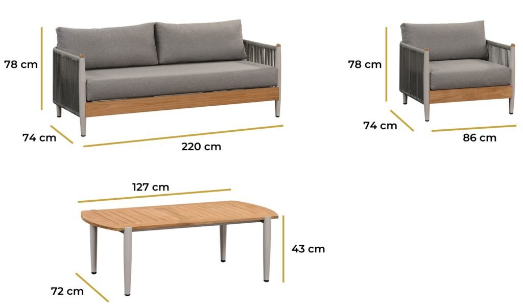 Elegant natural teak detailing on the armchairs and sofa frames adds warmth and timeless character, creating a striking contrast against the sleek metal structure. At the heart of the set, the natural teak coffee table completes the look, introducing rich texture and organic appeal while offering outstanding durability for everyday outdoor use.