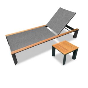 A sleek, contemporary sun lounger set with a rust-free powder-coated aluminium frame and weatherproof textilene fabric for comfort. Finished with natural teak accents and adjustable leg caps, it offers stability, durability, and premium style for any outdoor space. Relax in full comfort with a convenient and compact aluminium side table with complimenting natural teak tabletop.