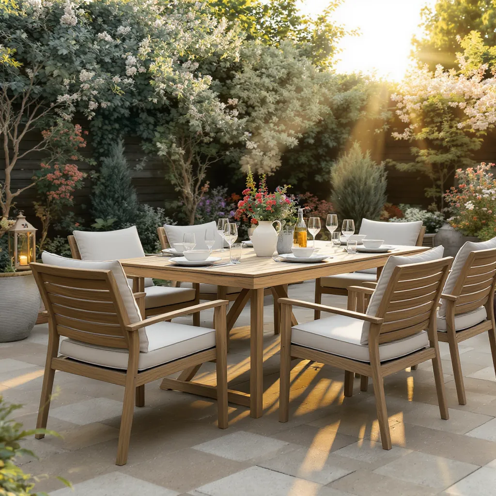 Wood offers a warm, natural look that blends beautifully with garden settings. Teak is a top choice for outdoor use thanks to its weather resistance and longevity. However, wood requires regular care โ oiling or sealing โ to maintain its appearance. For more on wooden furniture, see our guide on best materials for outdoor furniture.
